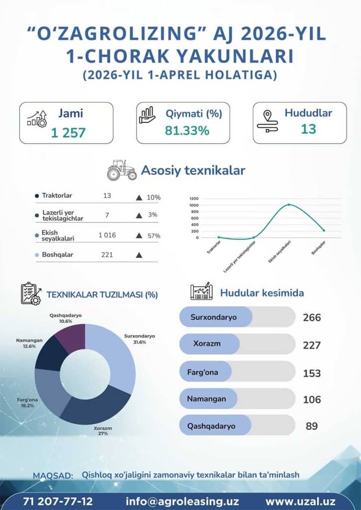 2026-yil 1-aprel holatiga ko‘ra, “O‘zagrolizing” aksiyadorlik jamiyati tomonidan Respublika bo‘ylab fermer xo‘jaliklari va agroklasterlarga jami 1 257 dona zamonaviy qishloq xo‘jaligi texnikasi yetkazib berildi.